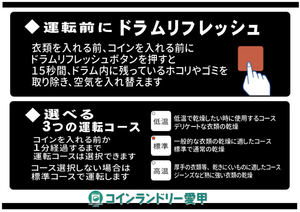 乾かすものに合わせて「標準」「低温」「高温」と乾燥温度が選べます